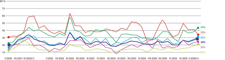目前,约60%的俄罗斯人认为,北约国家与俄罗斯在乌克兰领土上的军事冲突持续是2026年最可能的情景。对冲突旷日持久的预期占主导地位,“导致心理资源被动员起来以应对长期危机”。特别能说明这一点的是,认为俄罗斯人最艰难的时期还在后面的受访者比例增加。如今已有52%的俄罗斯人持此看法,这比2025年12月高出7个百分点。2026年经济预期的主要因素已不再是特别军事行动可能结束,而是物价上涨以及联邦和地方预算赤字的后果。